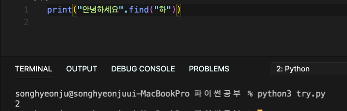 문자열 내에서 찾고자 하는 매개변수가 몇번째 인덱스에 처음으로 등장하는지 출력 (기본적으로 주어진 문자열의 왼쪽부터 찾음)