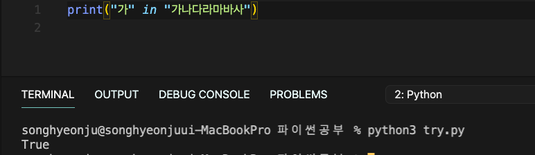 : 문자열처럼 보일 수 있으나, in도 연산자의 역할을 한다. 변수가 해당 문자열 내에서 존재하는지에 대한 참거짓 여부를 반환