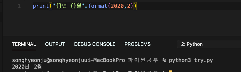"{} {}".format(1,2) -> { } 자리에 매개변수로 대체된다. 괄호의 수와 매개변수의 갯수는 맞춰줘야한다.