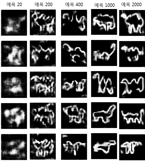 -> 이렇게 두 모델이 대립하면서 발전해 에폭(epoch)이 지날 때마다 랜덤 이미지가 점점 동물을 닮아가는 것을 볼 수 있습니다.