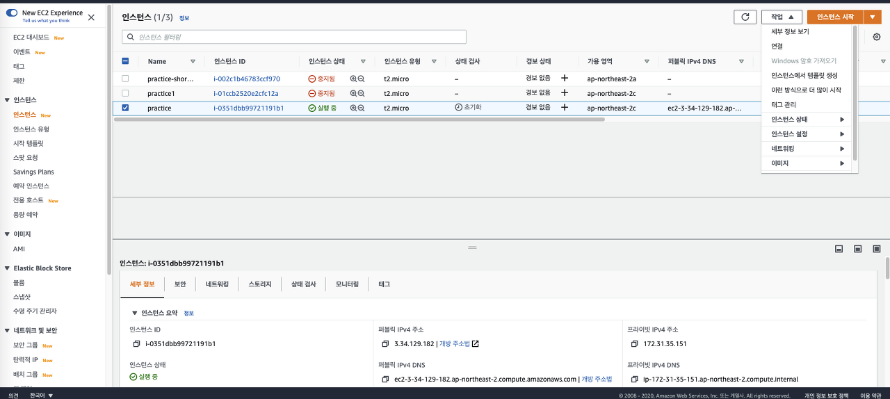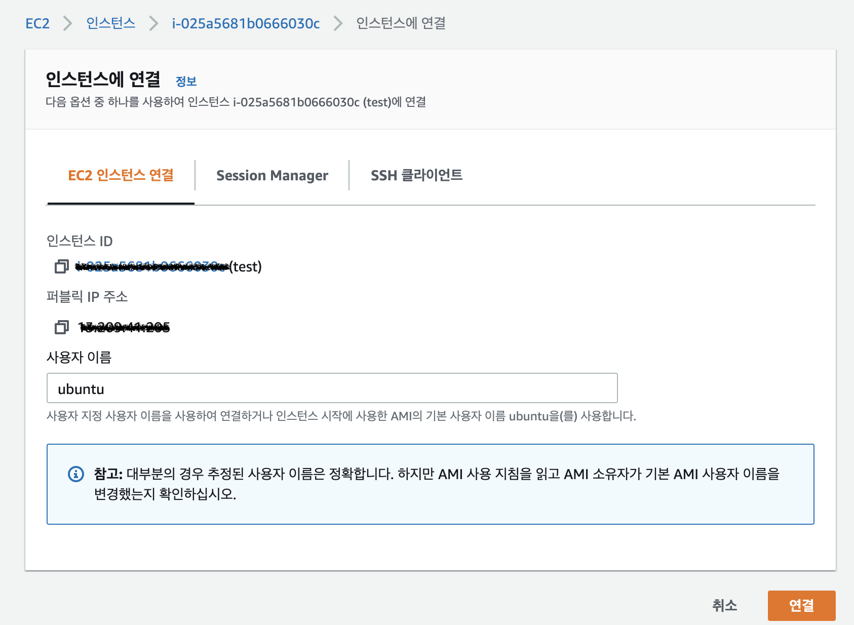 만들어둔 인스턴스들을 볼 수 있는 아래 화면에서 연결하고자 하는 인스턴스를 클릭하여 작업->연결항목으로 들어가자.