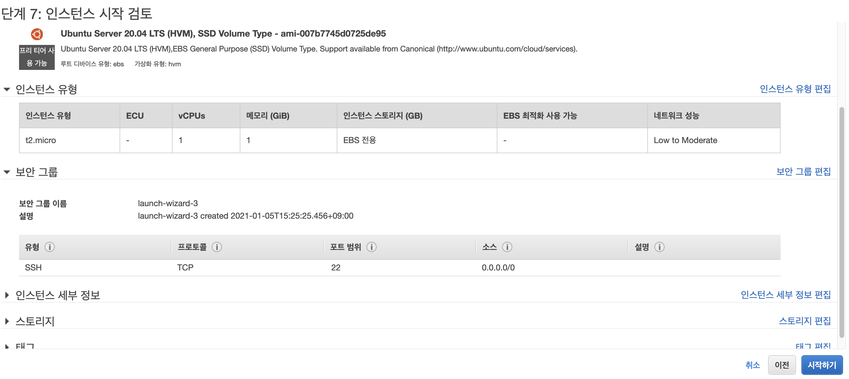 인스턴스 시작 검토 부분을 누르면 아래와 같은 화면이 뜬다. 바로 시작하기버튼을 클릭하자.