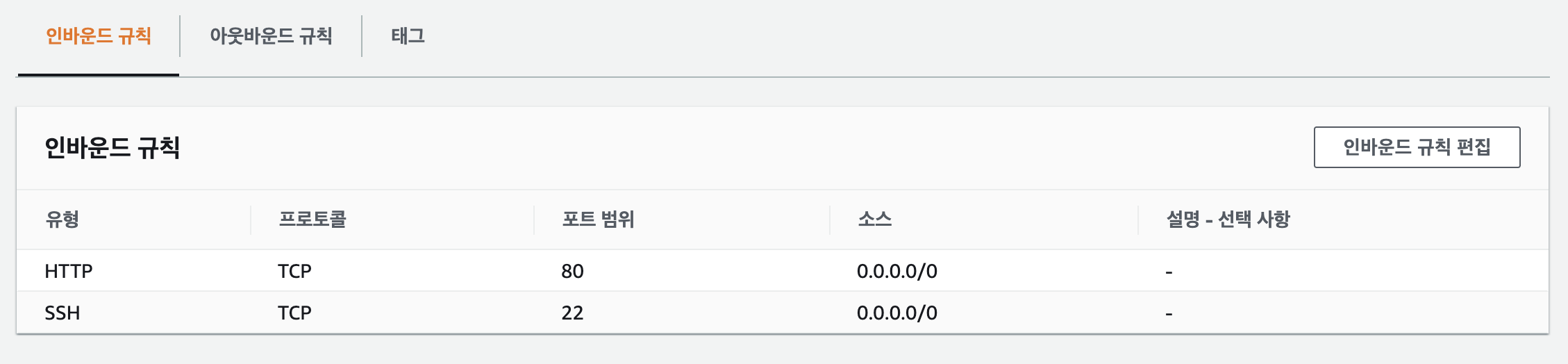 - 아웃바운드 규칙 : ec2에서 외부로 접속하는 것(모두 열어두기)