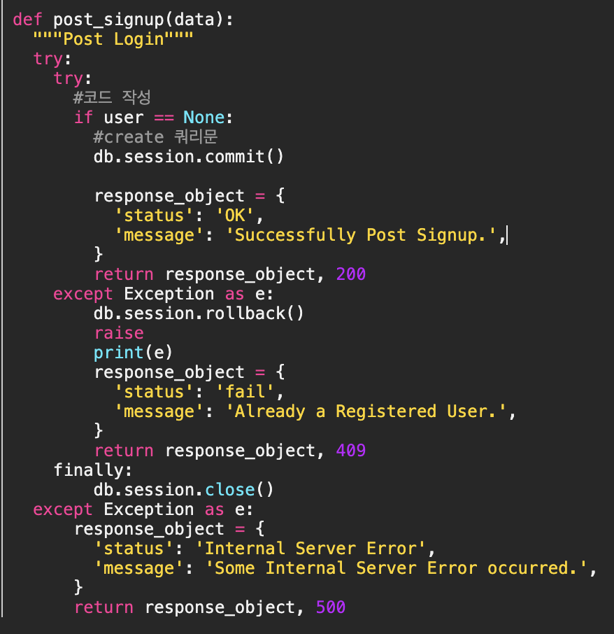 전체적으로 try/except 구조로 서버 코드를 작성했으며, transaction이 잘 마무리 되어서 해당 쿼리가 완전히 다 실행완료 된것을 알리는 commit 코드를 try 문 마지막에 작성하고, 에러 발생시에 rollback 해주는 코드를 except코드에 작성했다.