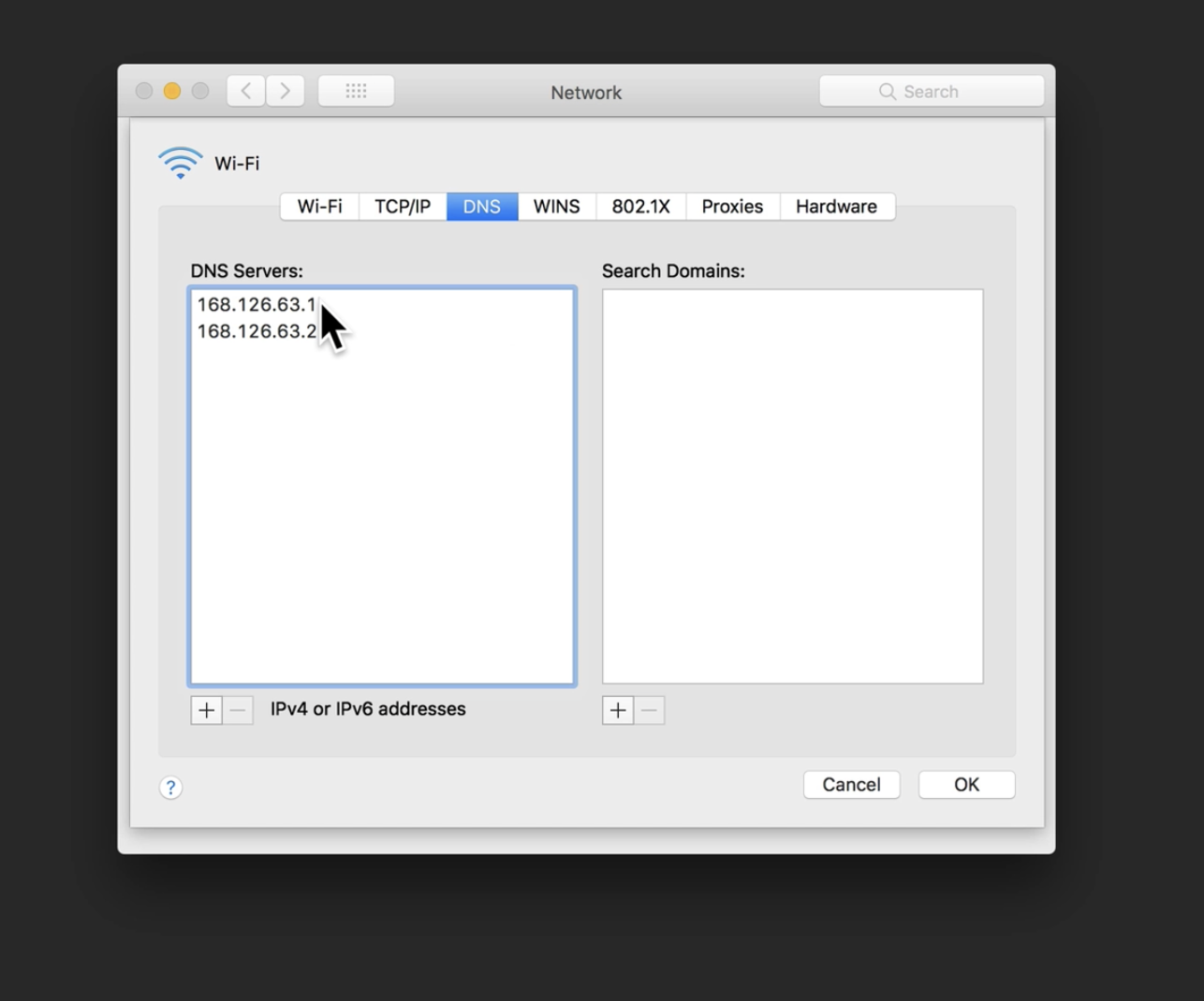 아래의 그림은 실제 우리가 사용하는 컴퓨터(맥기준) 환경설정에서 자동으로 연결되어있는 DNS server주소를 알 수 있다. 이는 각자 컴퓨터마다 제공되는 server ip 주소가 다를 것이다.