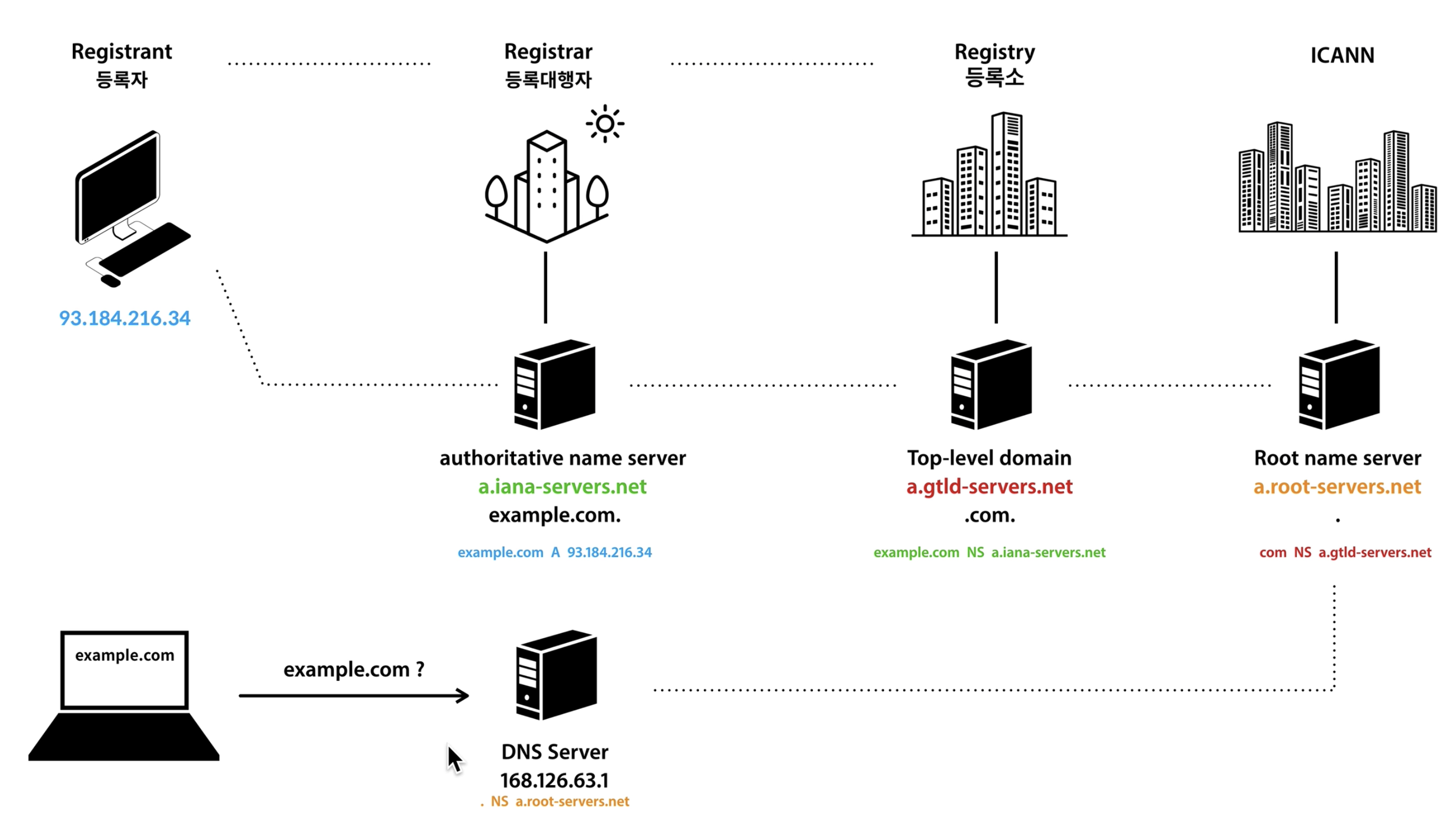 위의 그림에서 우리는 일종의 등록 대행자를 통해서 도메인을 발급하여 사용할 수 있게 된다.