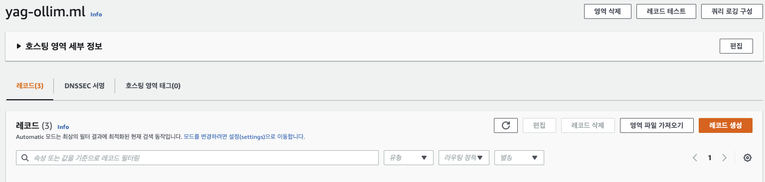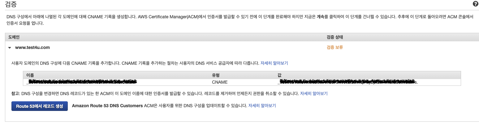 -> 여기서 중요한 점은 Route 53에서 DNS를 만들지 않았다면 레코드 생성 버튼이 없으므로, 우선 Route 53에서 해당 도메인으로 DNS부터 생성해야 한다.