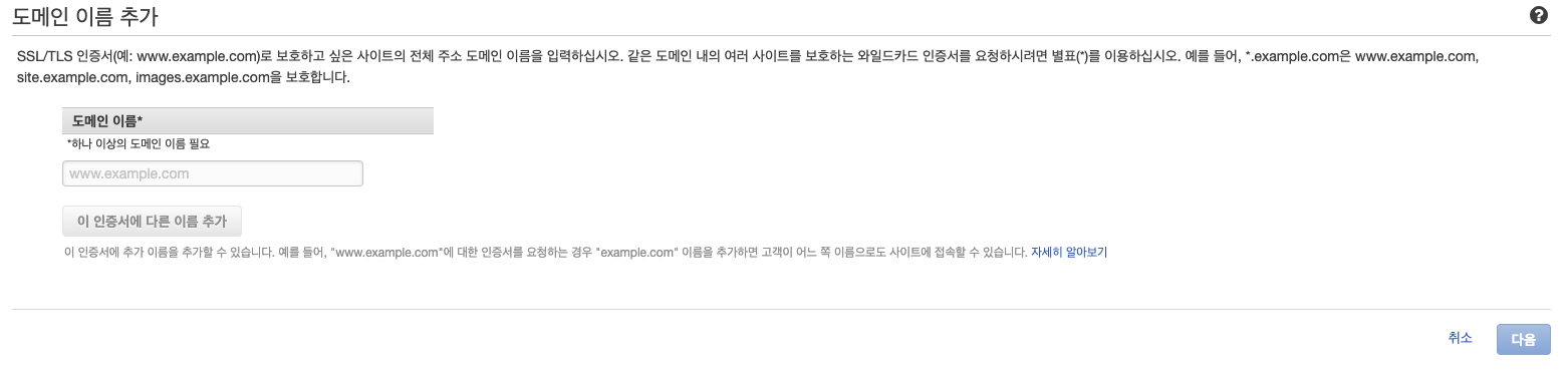 a. ACM으로 들어가서 인증서 요청을 클릭하고 도메인 주소 추가