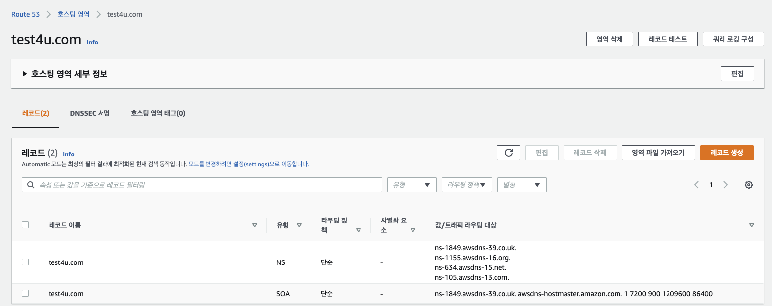 간단하게 발급이 가능하다. 또한 Route 53호스팅 생성과 동시에, 내가 사용하고자 하는 도메인에 해당하는 NS 또한 생성된다.