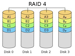 현재는 (거의) 사용하지 않는 RAID Level. Block 단위로 striping을 하고, error correction을 위해 패리티 디스크를 1개 사용한다. 용량 및 성능이 단일 디스크 대비 (N-1) 배 증가한다. Block 단위로 striping 하는 것은 RAID 5, RAID 6와 동일하지만, 패리티 코드를 동일한 디스크에 저장하기 때문에, 패리티 디스크의 사용량이 높아 해당 디스크의 수명이 줄어든다.