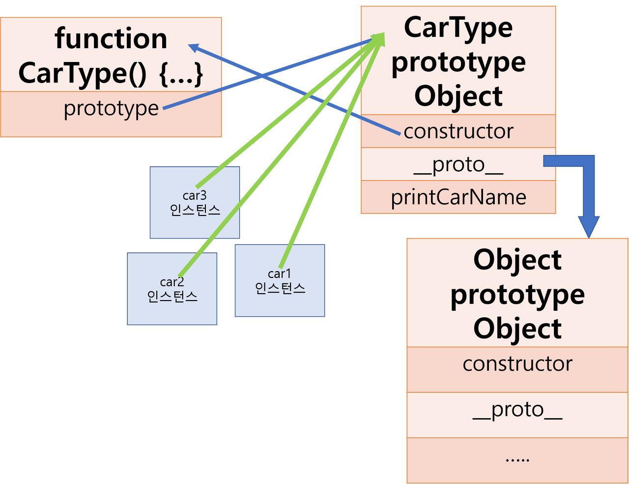 (인스턴스의 __ proto __도 생성자 함수의 prototype객체의 printCarName을 가리킨다.) 함수가 생성되면서, 함수는 생성자 자격을 얻게되고, prototype Object를 생성한다. 함수의 prototype프로퍼티를 통해서 prototype Object를 가리킨다.
