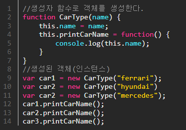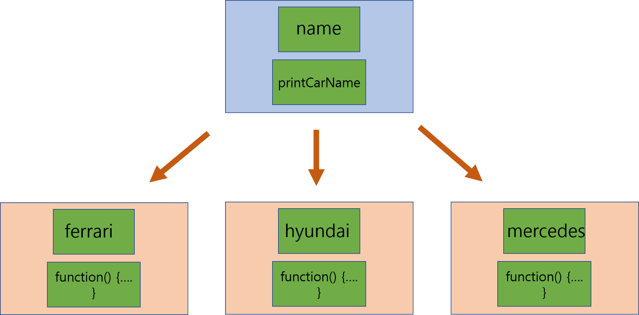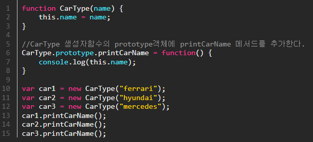 프로토타입 객체를 이용하면, 생성자 안에 있는 프로토타입 프로퍼티(CarType)가 외부에 정의된 객체(car1, car2, car3)를 가리킨다. 그리고 그 프로토타입 객체에 prototype키워드로 객체와 지정한 함수(printCarName)를 저장하는 것이다.