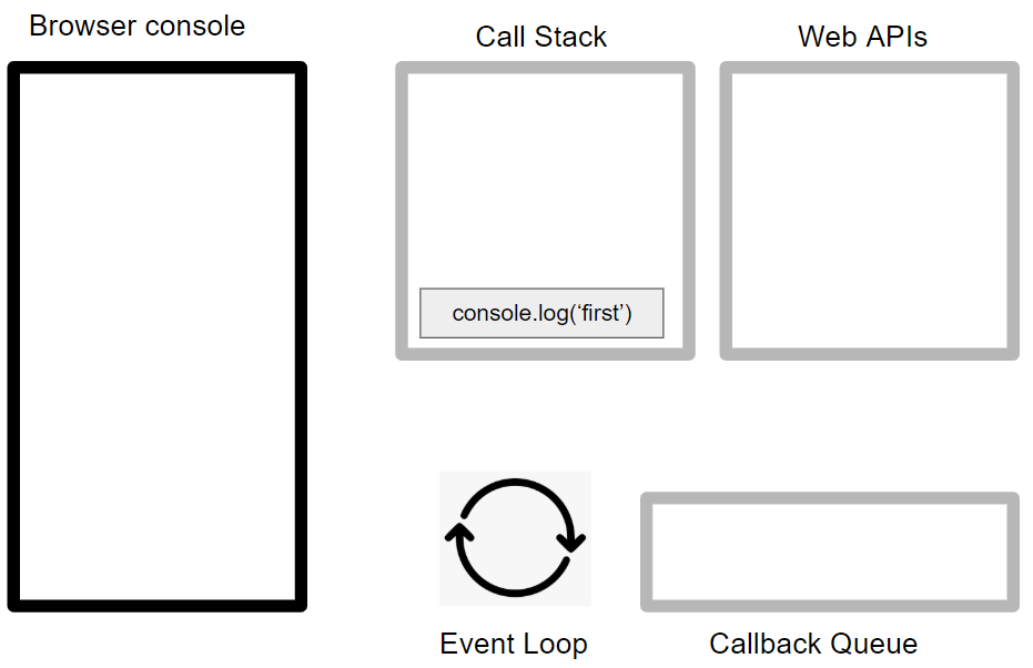 2. console.log(‘first’)가 실행되어 화면에 출력한 뒤, Call Stack에서 제거(pop)