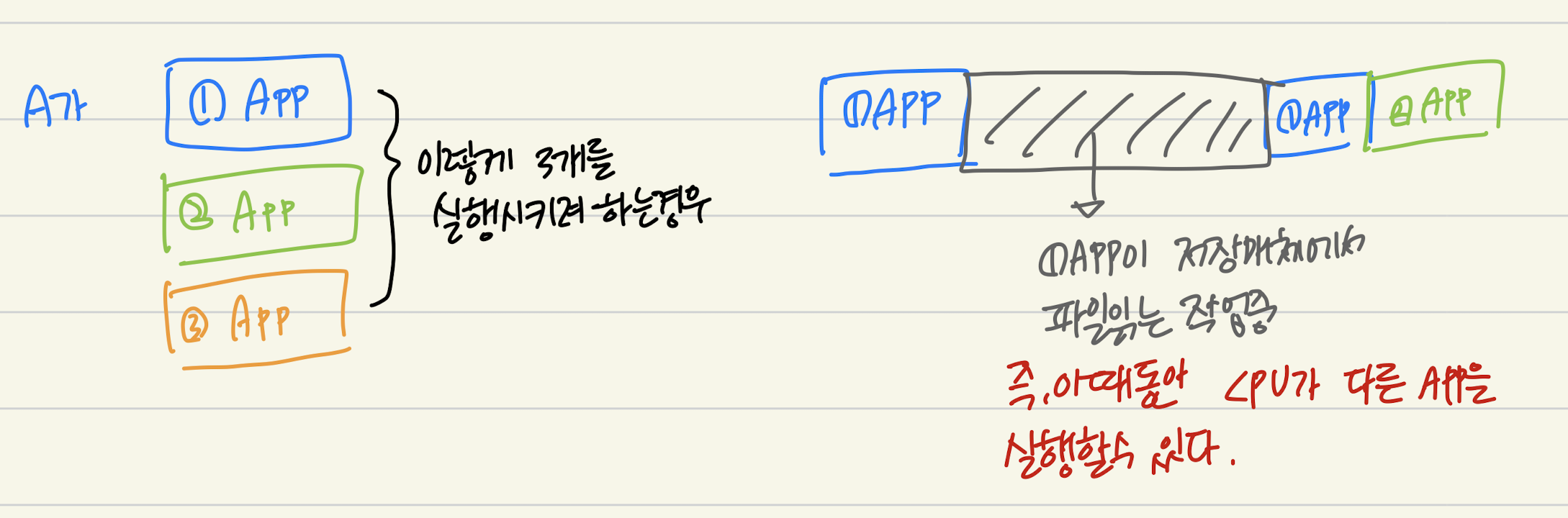 -> 물론 CPU가 여러개인 경우엔, 각 작업을 각 CPU에 나눠서 동시에 작업하게 할 수 있는 병렬처리가 가능할 것이다. 즉 멀티 프로세싱을 의미한다.