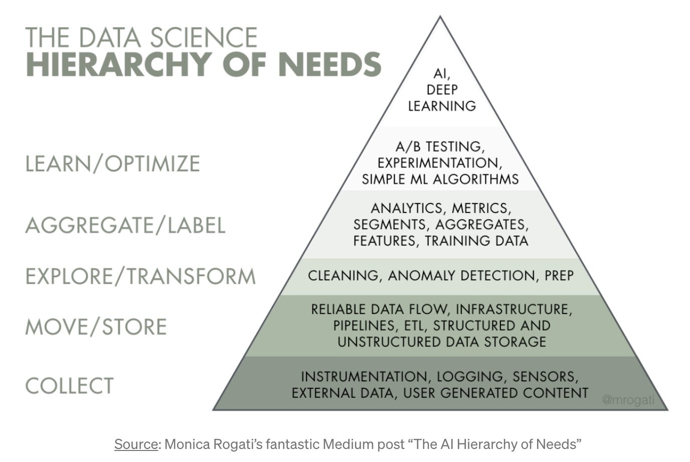 Think of Artificial Intelligence as the top of a pyramid of needs. Yes, self-actualization (AI) is great, but you first need food, water, and shelter (data literacy, collection, and infrastructure).