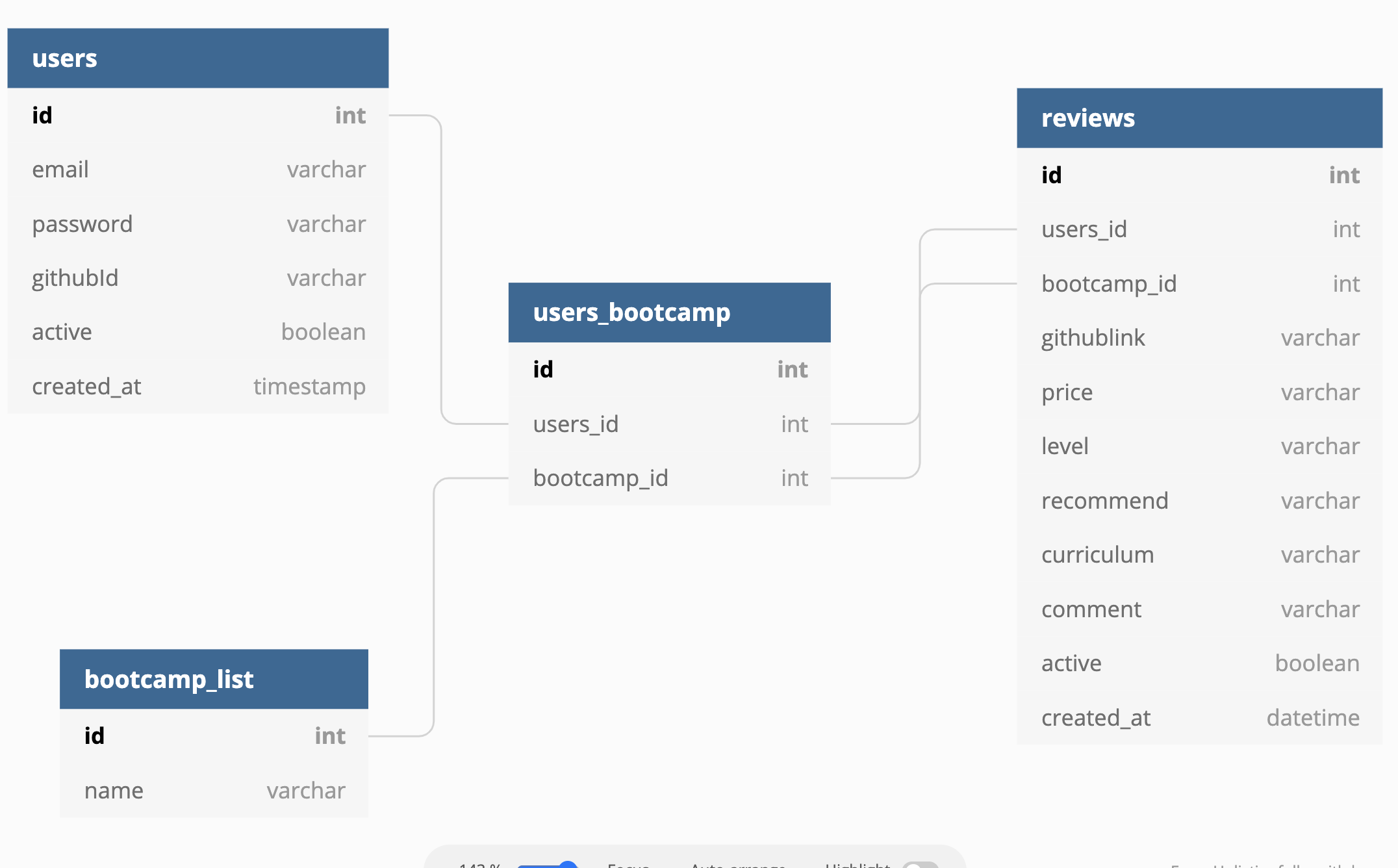 -> users_bootcamp 테이블은 삭제해도 되는 테이블인 것이다. reviews 테이블이 실제로 users와 bootcamp_list 테이블의 다대다 역할을 해주고 있는 것이다. (이는 추후 리팩토링하면서 마이그레이션을 다시 진행하고 재배포할 예정이다.)