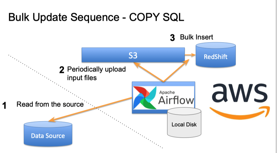 -> S3 에서 redshift로의 작업이 가장 효율적이다. 같은 aws프로그램 내 + copy command사용