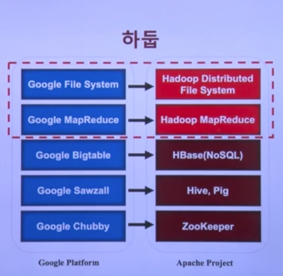 - 분산 파일시스템과 분산 파일 시스템에 저장된 데이터를 분산 병렬 처리가 가능한 맵리듀스라는 프레임웤이 내장된 것이 하둡이다.