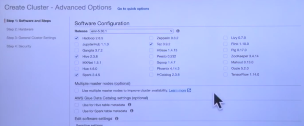 -> EMR은 elastic mapreduce라고 해서 하둡 에코시스템을 클라우드서비스로 제공 / 위에 설명한 다양한 설정들을 EMR에서 하둡 클러스터를 손쉽게 설정가능하다.