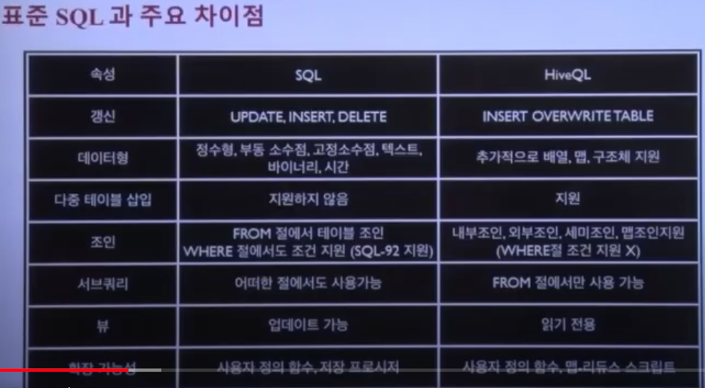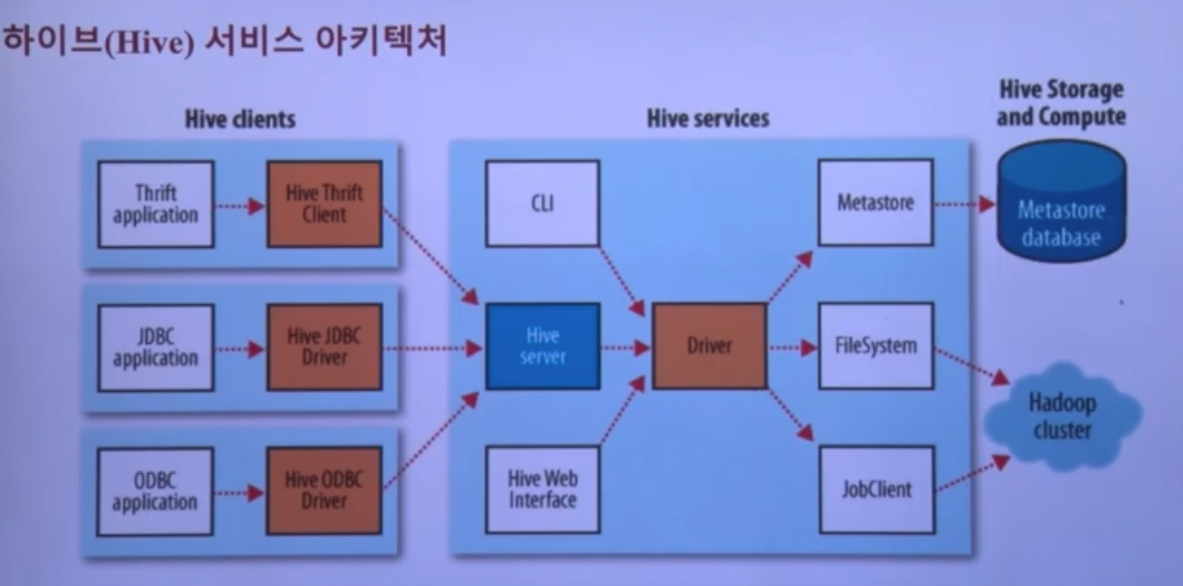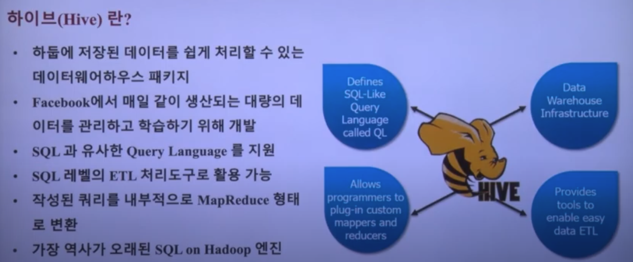 - Hive : SQL을 지원하는 하둡의 쿼리엔진