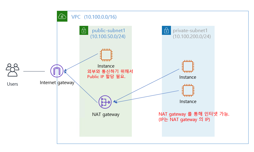 - private subnet에 있는 인스턴스들은 인터넷에 접근할수 없지만, private subnet에서 접근할 수 있는 NAT(Network Address Translation)용 인스턴스를 public subnet에 만들어서 private subnet에 있는 인스턴스들은 인터넷에 접근할 수 있게 된다.
