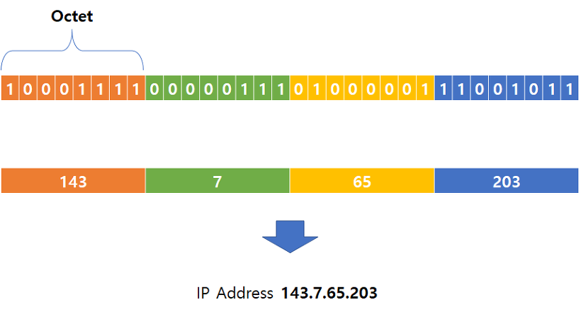 여기서 잡고 넘어가면 좋을 개념으로 옥텟(Octet)이 있다. 사전적의미로는 컴퓨터에서 8개의 비트가 한데 모인 것을 말한다. IPv4 주소에서의 옥텟이라는 말의 의미는 32비트의 IP주소를 8비트로 나누는 단위라고 할 수 있다. 즉 IP주소는 32비트로 이루어져 있고, 그것을 옥텟단위로 끊어서 표현한다. 아래의 그림처럼 실제 IP주소는 컴퓨터에 저장될 때 비트단위로 저장되어 있을 것이며, 그것을 옥텟단위로 구분하여 10진수의 정수로 표현하고 각 옥텟사이를 마침표(.)로 구분해주면 우리가 일상적으로 사용하는 IPv4주소가 된다.