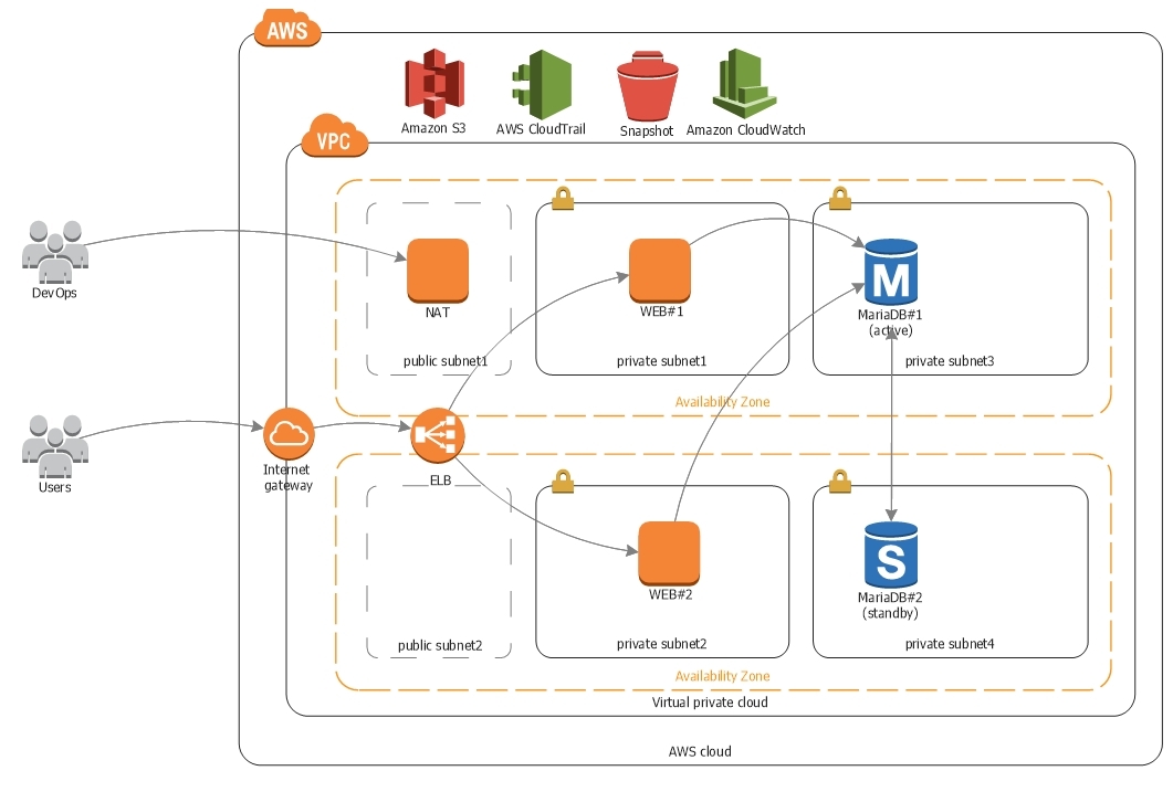 Internet Gateway연결을 통해서 외부와 통신할 수 있다. 내부에 Internet Gateway, ELB, Public IP/Elastic IP를 가진 인스턴스를 내부에 생성할 수 있다. 특히, Public Subnet 내에 있는 Nat Instance를 통하여 Private Subnet내에 있는 instances에 인터넷 접속이 가능하게 한다.