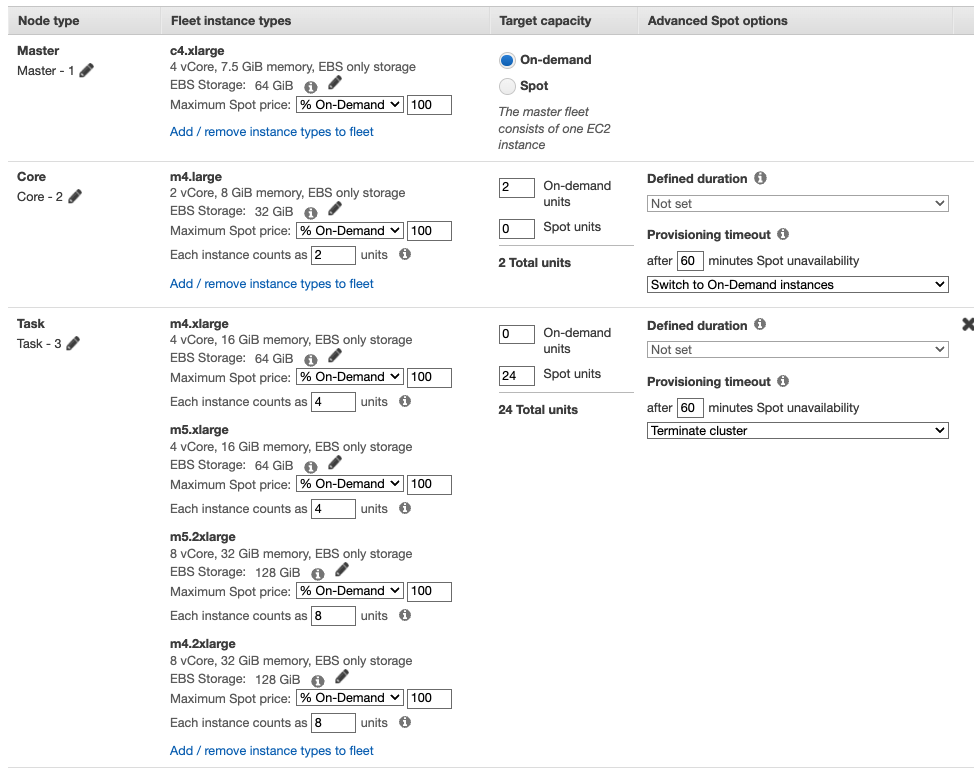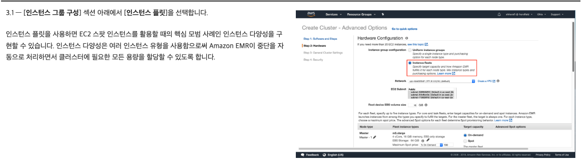 - instance fleet은 인스턴스내의 core에 따라 unit단위로 쪼개서 spot과 on demand로 좀 더 세부적으로 구성할 수 있으며 따라서 인스턴스 플릿으로 인스턴스 그룹 구성하기.