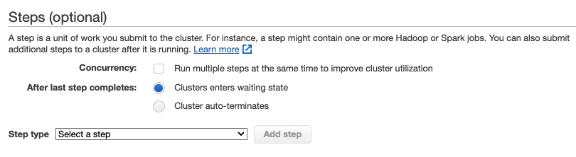 - steps기반으로 어떠한 액션을 제출해서 클러스터를 실행하게 되면 기본적으로 lambda를 바탕으로 실행된다. 그래서 추가적인 비용이 발생해서, 이에 대해서는 CLI로 접속해서 그때그때 실행해주는 방향 등이 있는데 나는 orchestration tool을 써서 job submmit을 해줄 것이다.