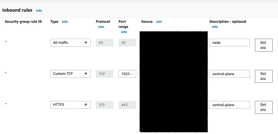 control-plane 보안 그룹에 대해 443,1025-65536 포트를 오픈한다,