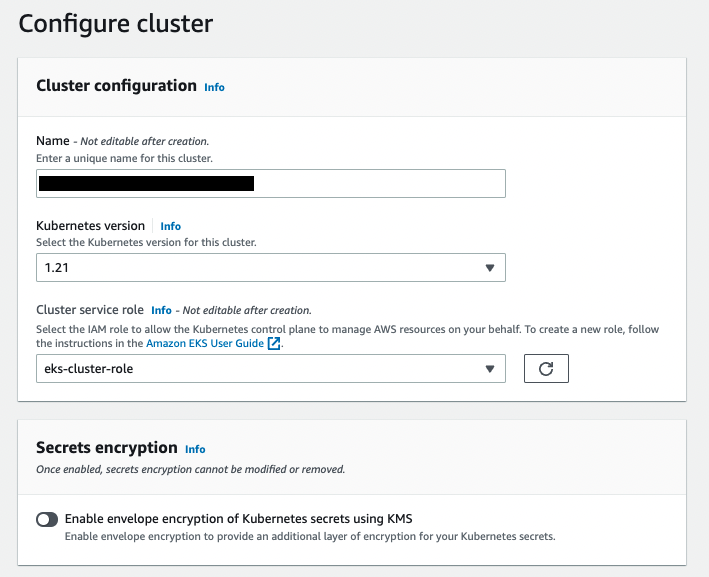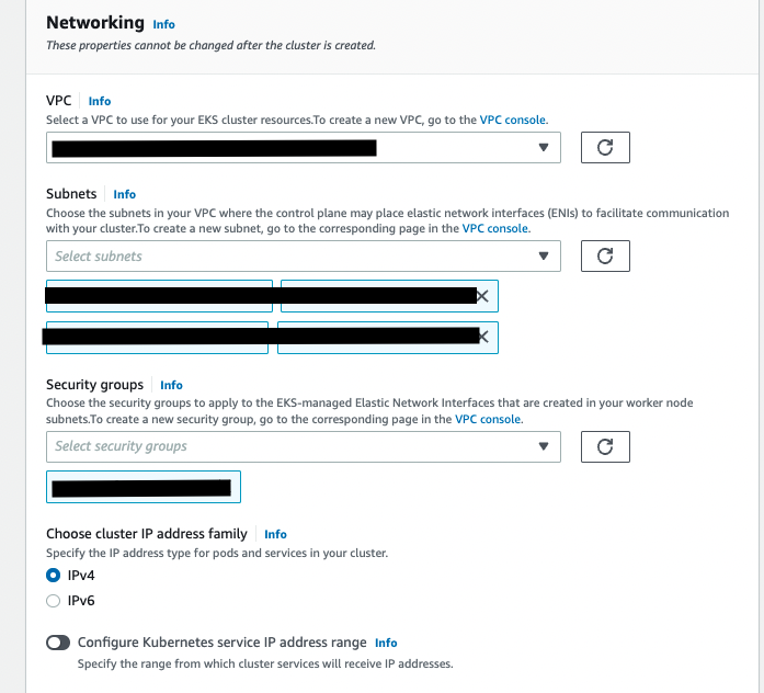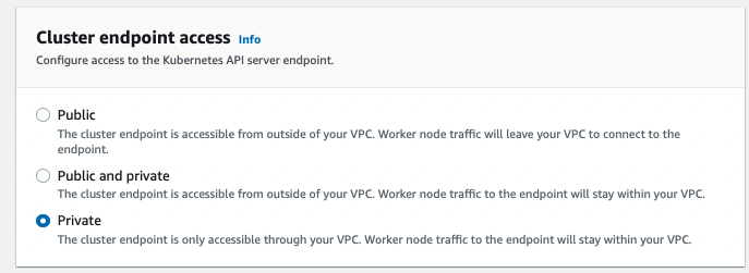 -> cluster endpoint 접근 권한은 private으로, 즉 api 서버에 대해 접근할 수 있는 권한 범위를 퍼블릭으로 열어둘 것이냐, private으로 둘 것이냐를 설정하는 것이다.