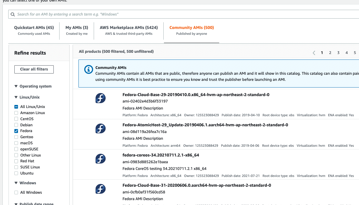 -> community AMIs > Fedora linuz/unix를 선택해주자