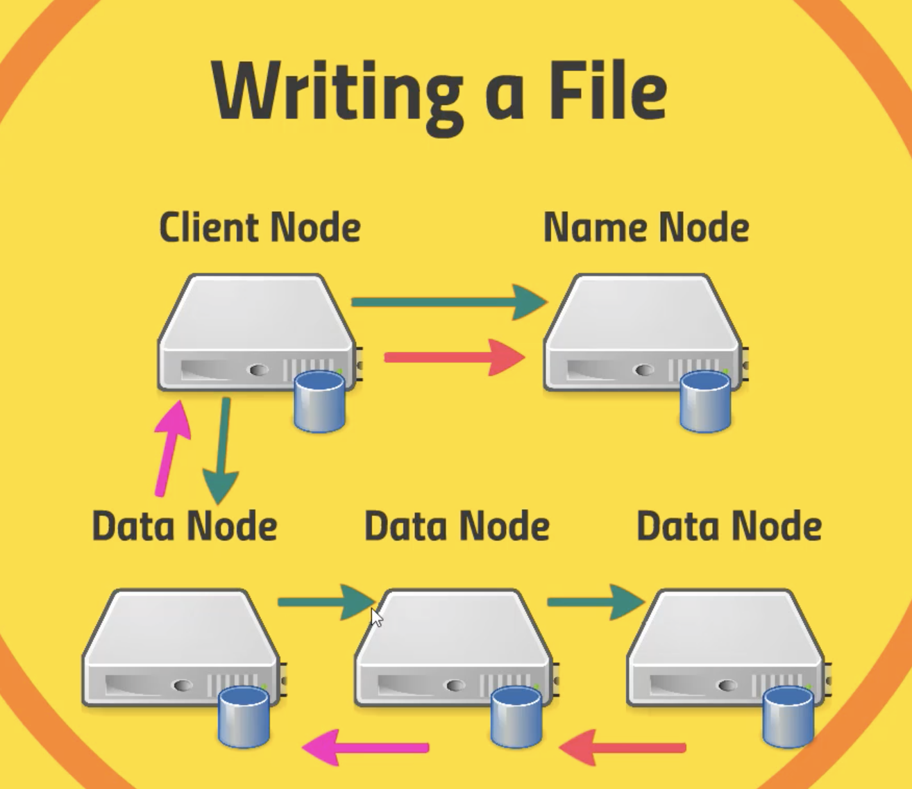 그러면 클라이언트는 정해진 '데이터 노드'에게 가서 파일을 건네주고 그 '데이터 노드'는 주변의 다른 '데이터 노드'에 복사본을 전달한다.
