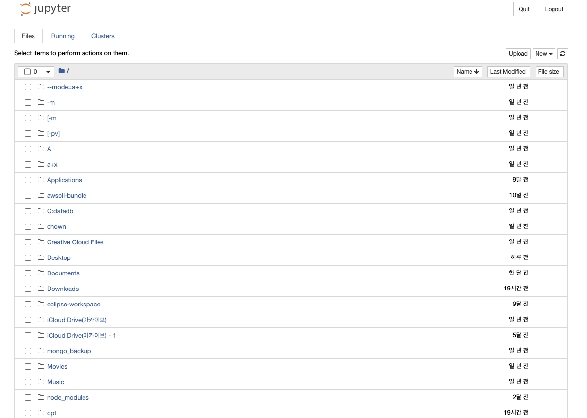 주피터 노트북에 들어가면 이런 페이지가 뜨면서, 마치 컴퓨터의 파인더처럼 폴더와 파일들을 볼 수 있다.