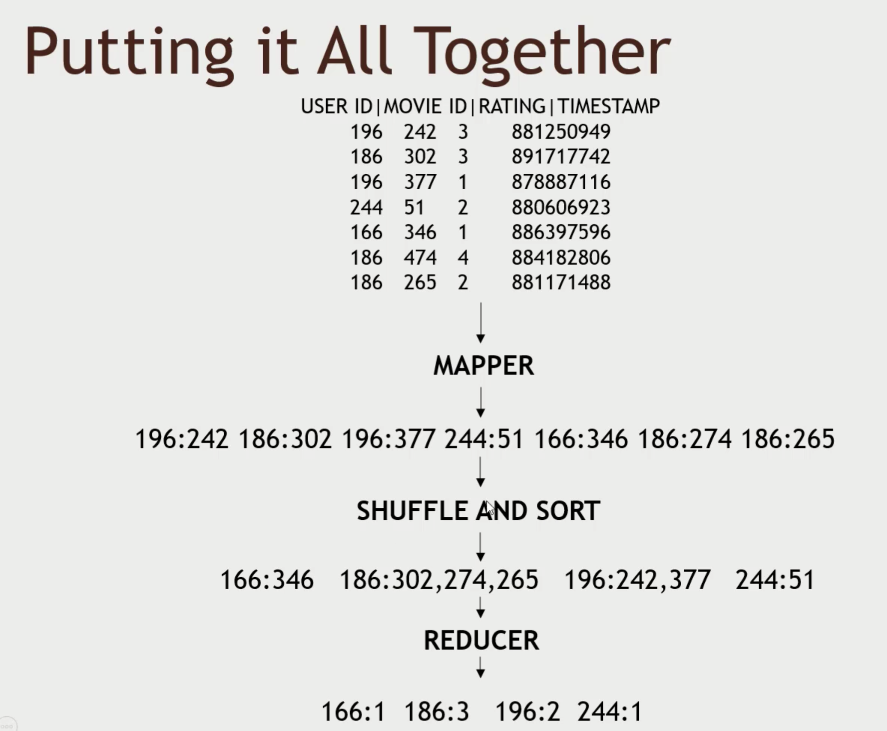 영화 평점 데이터에서 시작해 매퍼가 키-값 쌍을 추출했고 셔플과 정렬은 각 고유 키와 연관된 값을 구조화하고