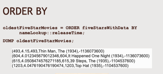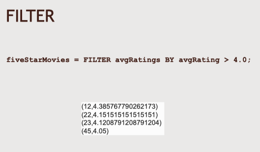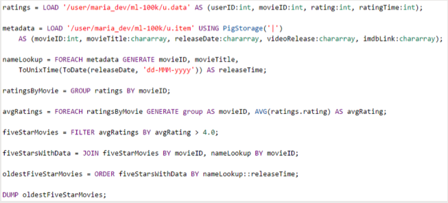 - 'IMPORT'는 Pig 파일의 매크로를 불러오는데 사용. 그러니까 재사용 가능한 Pig 코드를 매크로로 저장했다면 그 매크로를 다른 Pig 스크립트에 쉽게 불러올 수 있다.