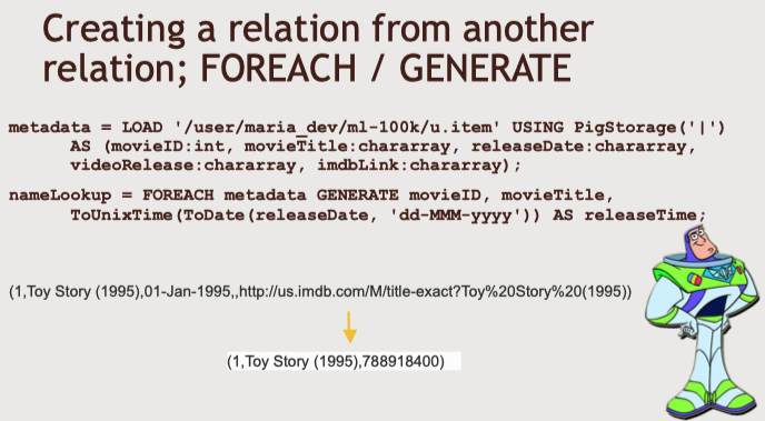 - 'FOREACH/GENERATE'를 사용해 기존 관계성의 데이터를 한 줄씩 가져와 변형해 새 관계성을 생성한다.