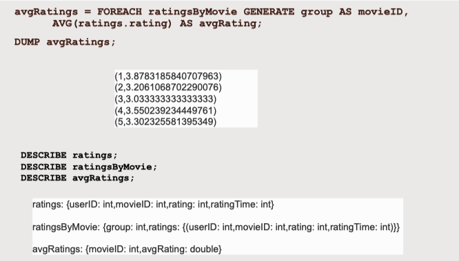 - 'DESCRIBE'는 주어진 관계성의 스키마를 보여준다. Pig가 그 관계성을 어떻게 보는지 내부의 이름과 유형을 보여준다.