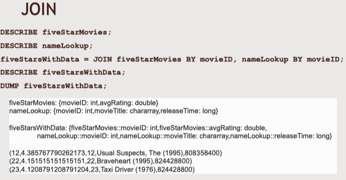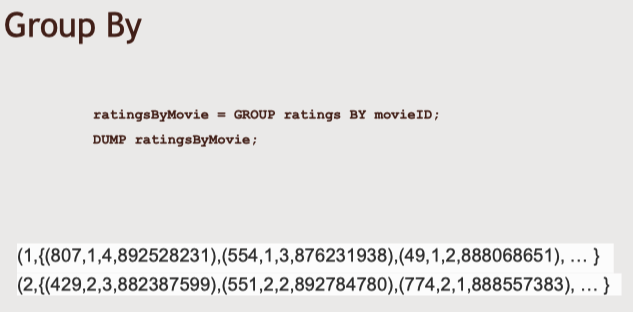 - 'COGROUP'은 'JOIN'의 변형. 'JOIN'에서는 합쳐진 행을 단일 투플에 넣는다면 'COGROUP'은 키별로 서로 다른 투플에 넣어 계층적 구조를 생성한다. 'JOIN'보다 조금 더 구체적이다. 'COGROUP'은 확실히 더 구조화된 데이터를 만든다.