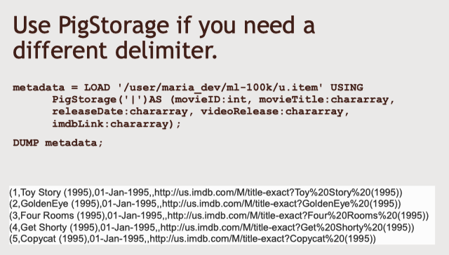 HDFS에 다운로드한 'u.item' 파일의 경로를 특정하고 'PigStorage'를 막대기 문자와 사용한다.