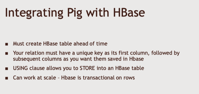 - Pig에서 이런 관계성을 스트립트의 각 라인에 만들고, 이러한 관계성은 고유한 키를 가져서 HBase 테이블에 저장할 열과 매핑할 열을 갖도록 한다.