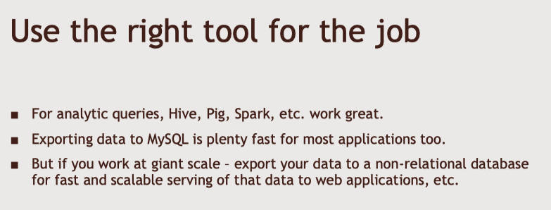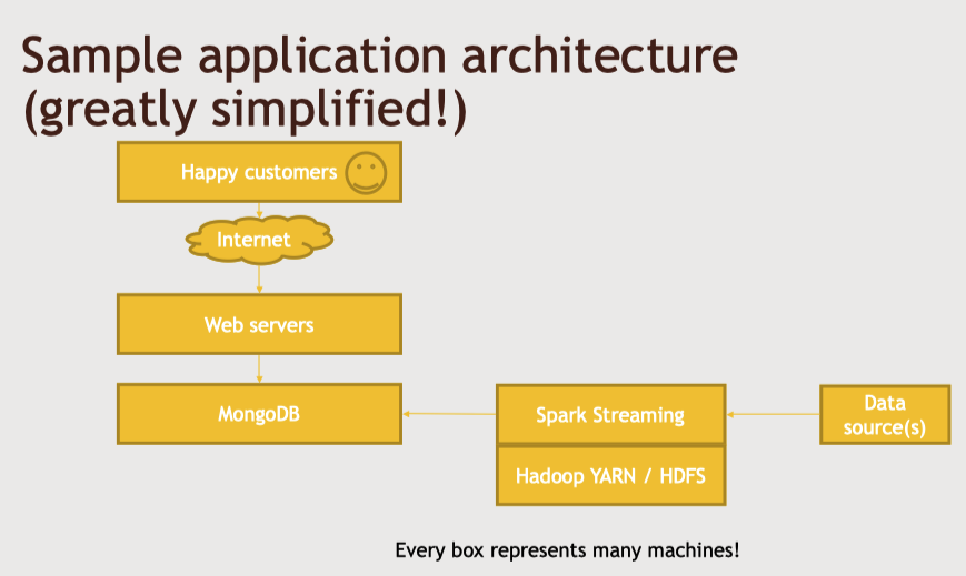 ✅ 아마존 같은 웹 사이트의 웹서버를 데이터 소스로 가지고 있다면 해당 데이터를 위 그림처럼 hadoop 클러스터를 이용해서 처리할 수도 있다. spark streaming이나 flumer같은 기술을 사용해서 서버에 송신하는 데이터를 수신하고 동시에 프론트 엔드에 필요한 양식으로 데이터를 변환해서 mongoDB 등에 저장한다.