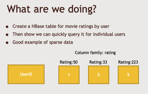 -> A라는 유저 기준으로, ID 50인 영화에는 1점을, 33인 영화에는 5점을 주었다는 것을 알수 있는 Hbase 구성
