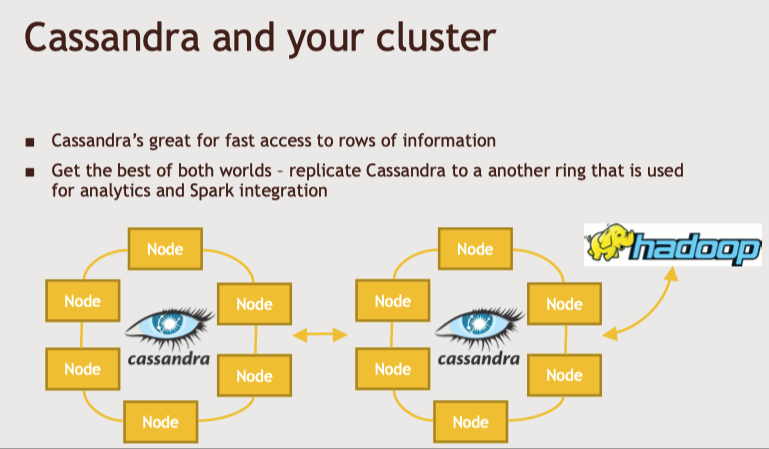 - 카산드라에 저장된 데이터를 스파크로 분석하거나/ 외부에서 들어오는 데이터를 스파크가 가공해서 카산드라에 저장하는 방식으로 둘을 결합해서 사용할 수 있다.