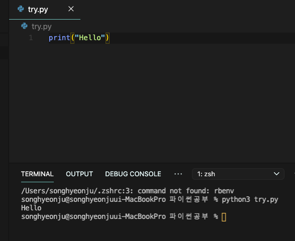 그리고 터미널에서 내용을 입력한 파이썬 파일이 있는 폴더에 들어가서