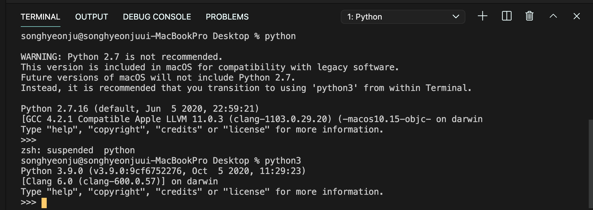 위와 같이 python이라고 임력하면 나는 2.7 구버전이 실행된다. warning이라고 뜨니까 좀 두려워서 python3라고 입력했고