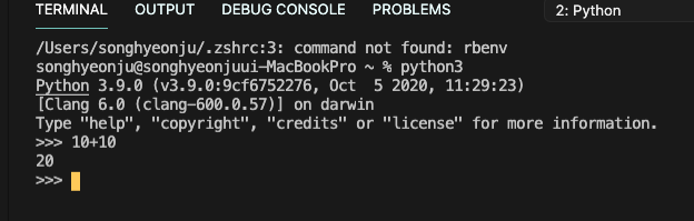 터미널에서 위와 같은 방법을 실행하면 코드를 입력하고 결과값을 볼 수 있게 된다.