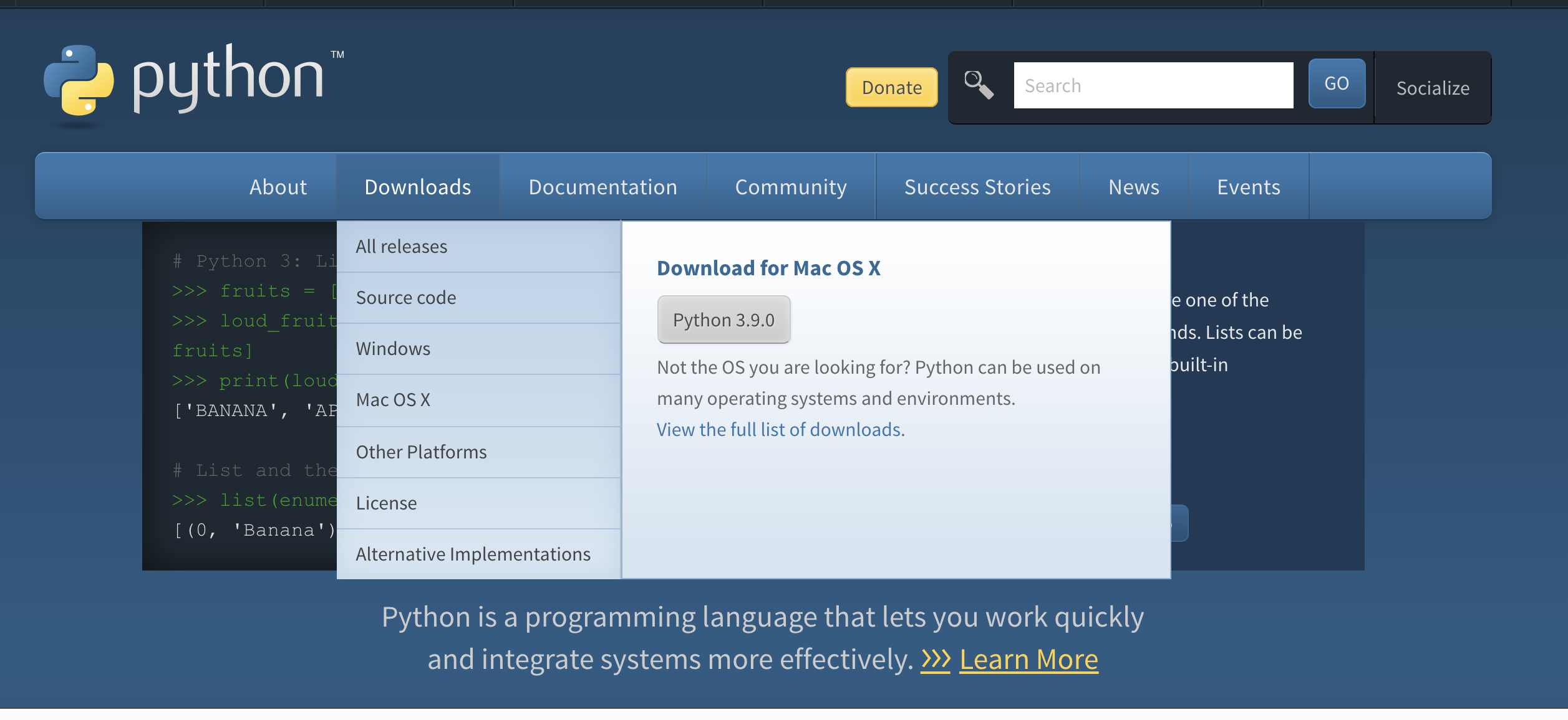 해당 화면에서 보이는 python 3.9.0 부분을클릭해서 설치해주어야 한다. 설치는 매우 빠름