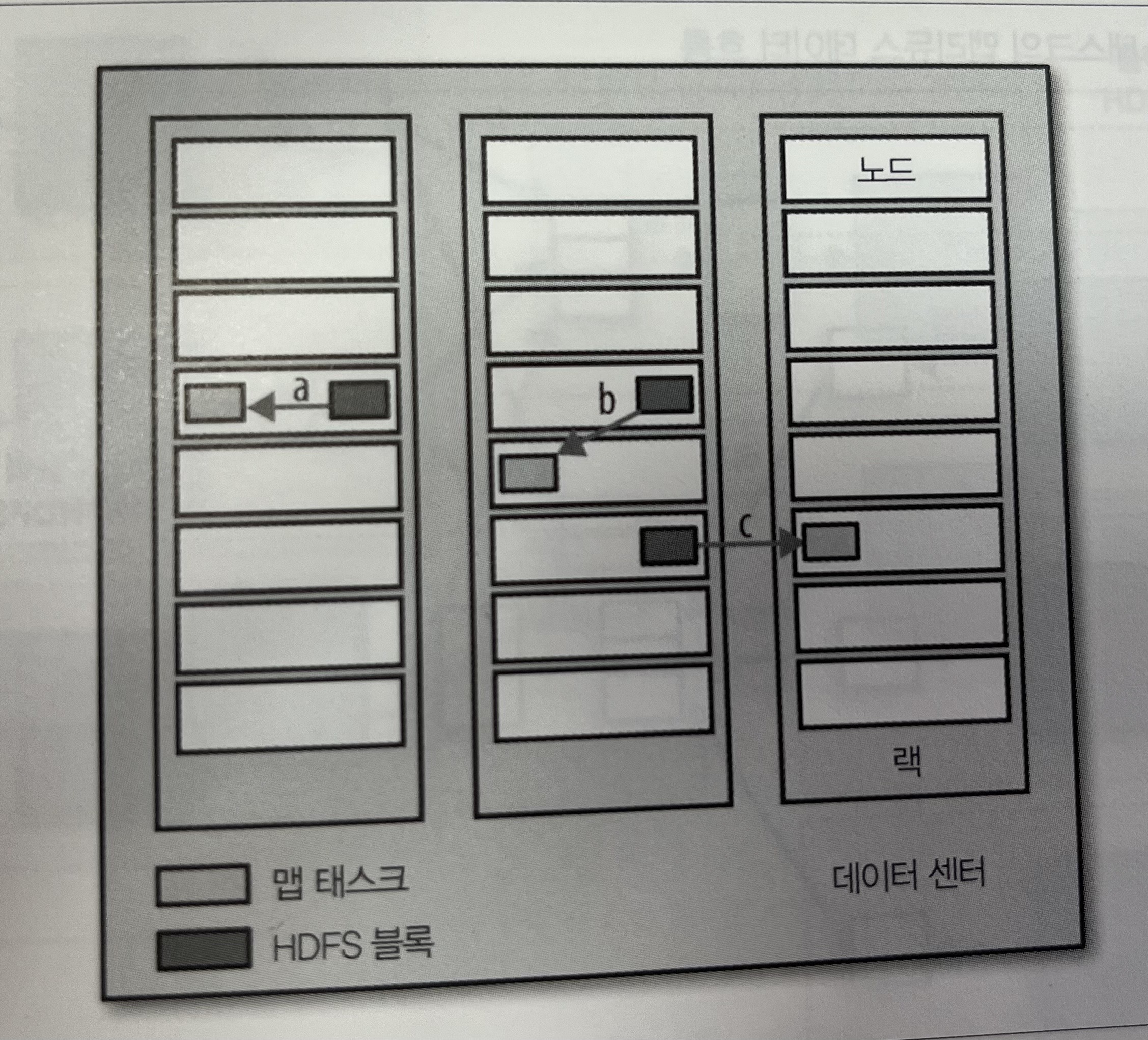 - 만약에 블록 복제본이 저장된 세개의 노드 모두 다른 맵 태스크를 실행하여 여유가 없다면, 저장된 동일 랙에 속한 다른 노드에서 가용한 맵슬롯을 찾느다(위 그림의 b)