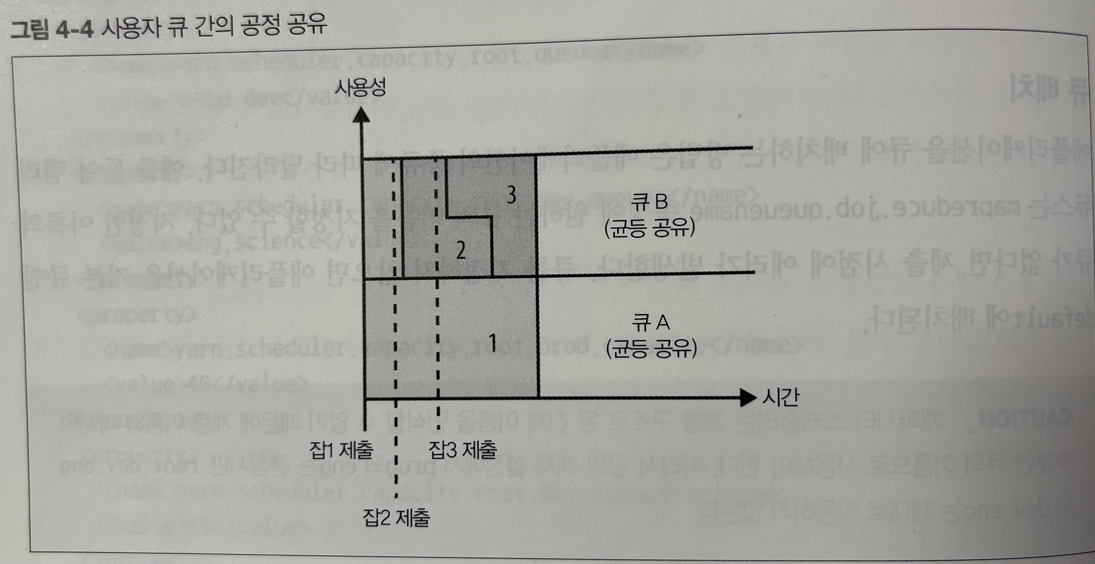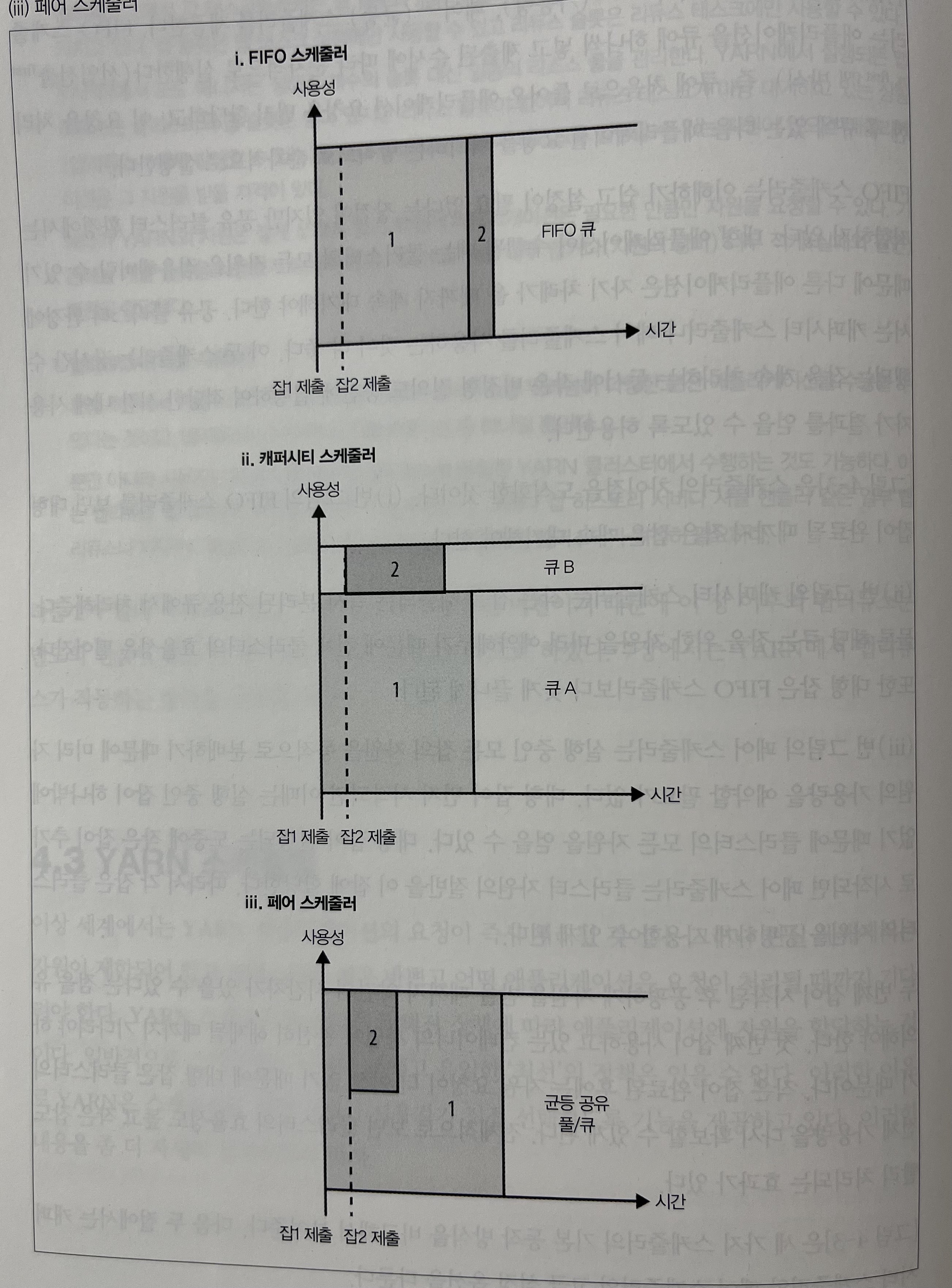 ii) 캐퍼시티 스케줄러는 작은 잡을 제출되는 즉시 분리된 전용 큐에서 처리. 해당 큐는 잡을 위한 자원을 미리 예약해두기 때문에 효율성은 떨어진다. 그리고 대형잡은 FIFO보다 늦게 끝난다.